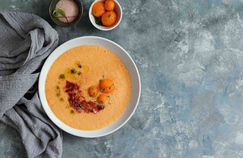 Dans un grand saladier, placez les dés de tomates et de poivron, les tomates cerises coupées en 4, le melon et la mangue coupés en dés, l’ail, la mie de pain, le curry, de la fleur de sel, du poivre, les feuilles de menthe et basilic, arrosez le tout d’huile d’olive et de vinaigre et placez au frais pour 2h.